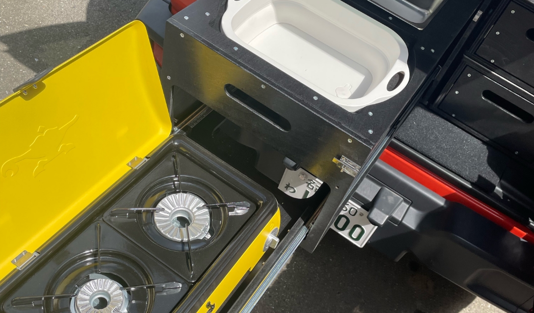 バックドアを開けると、“引き出すだけ”で使えるキッチンを装備。クルマさえあればすぐにソトアソビが楽しめます。