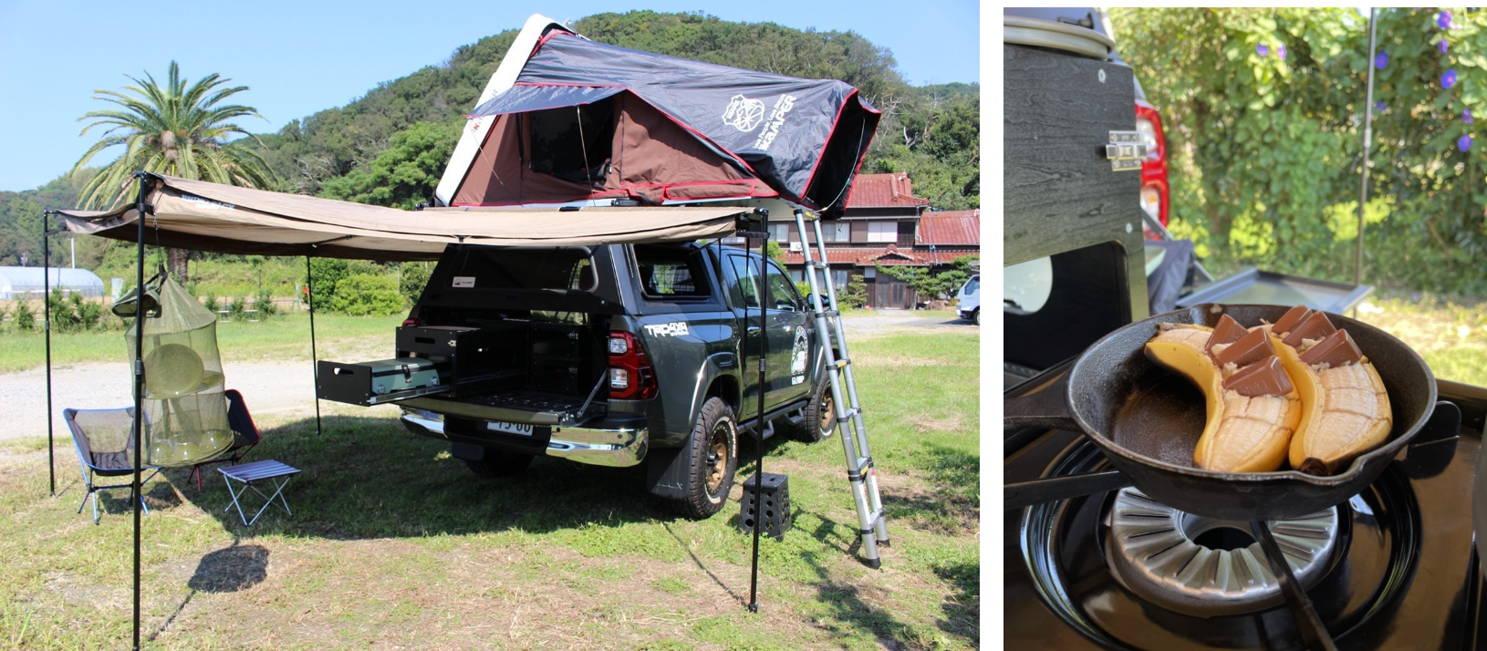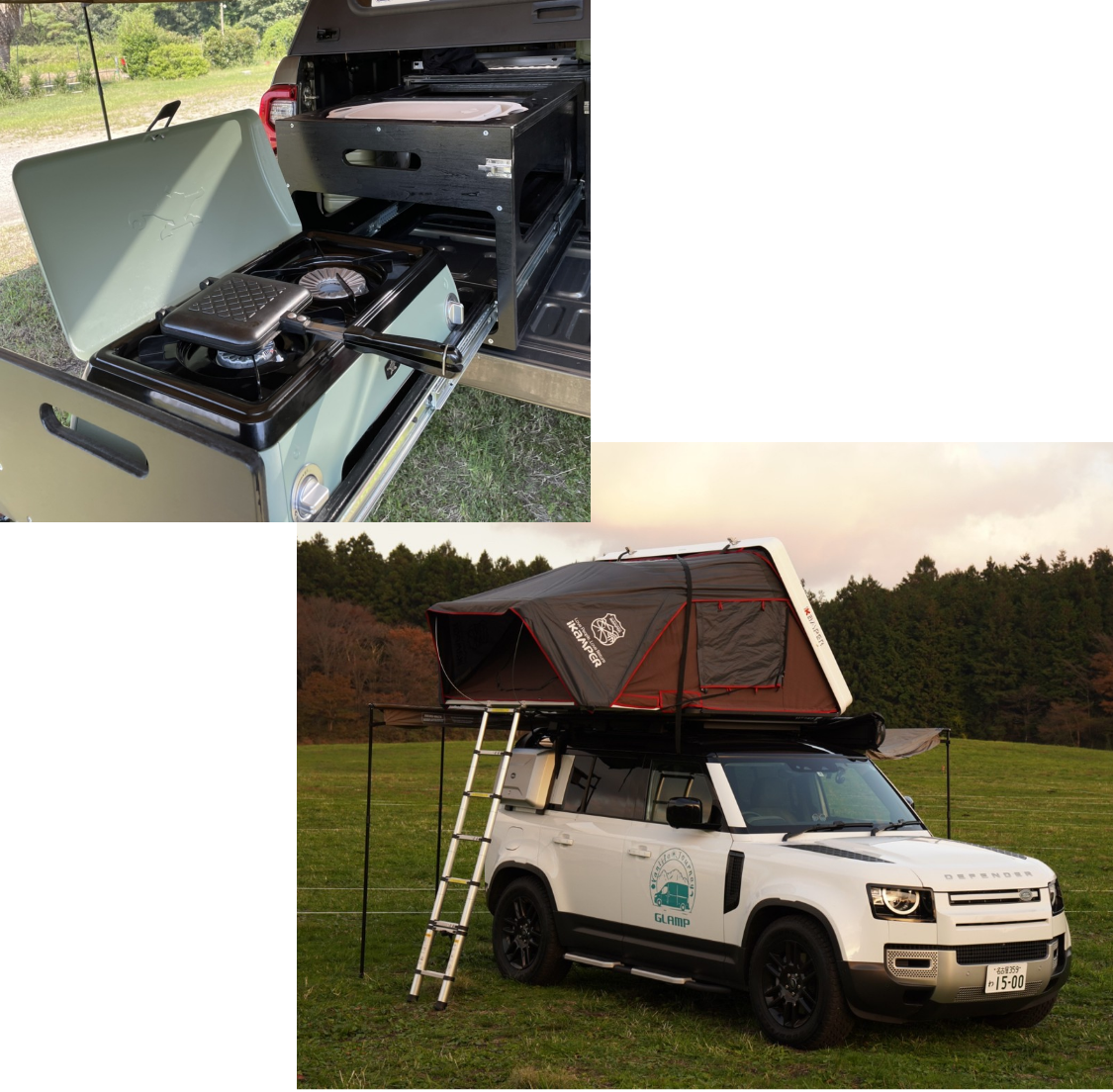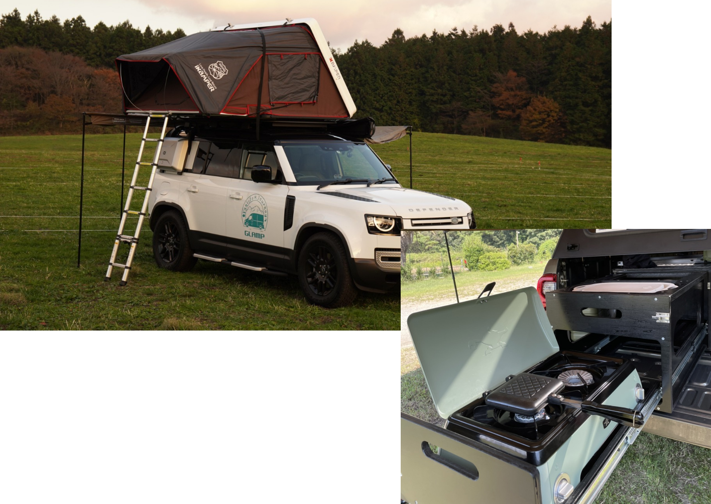 ルーフに積んだテントでの寝泊まりがいつもと違ったキャンプ体験を演出します。