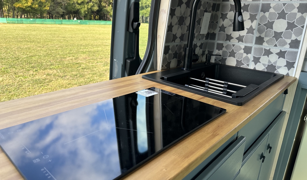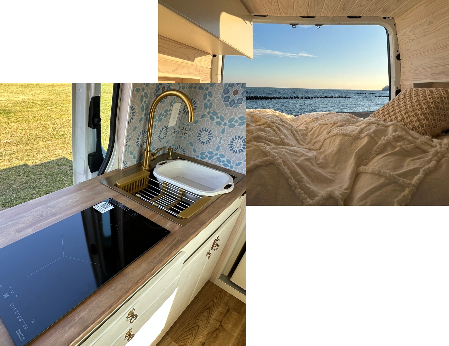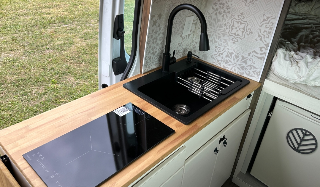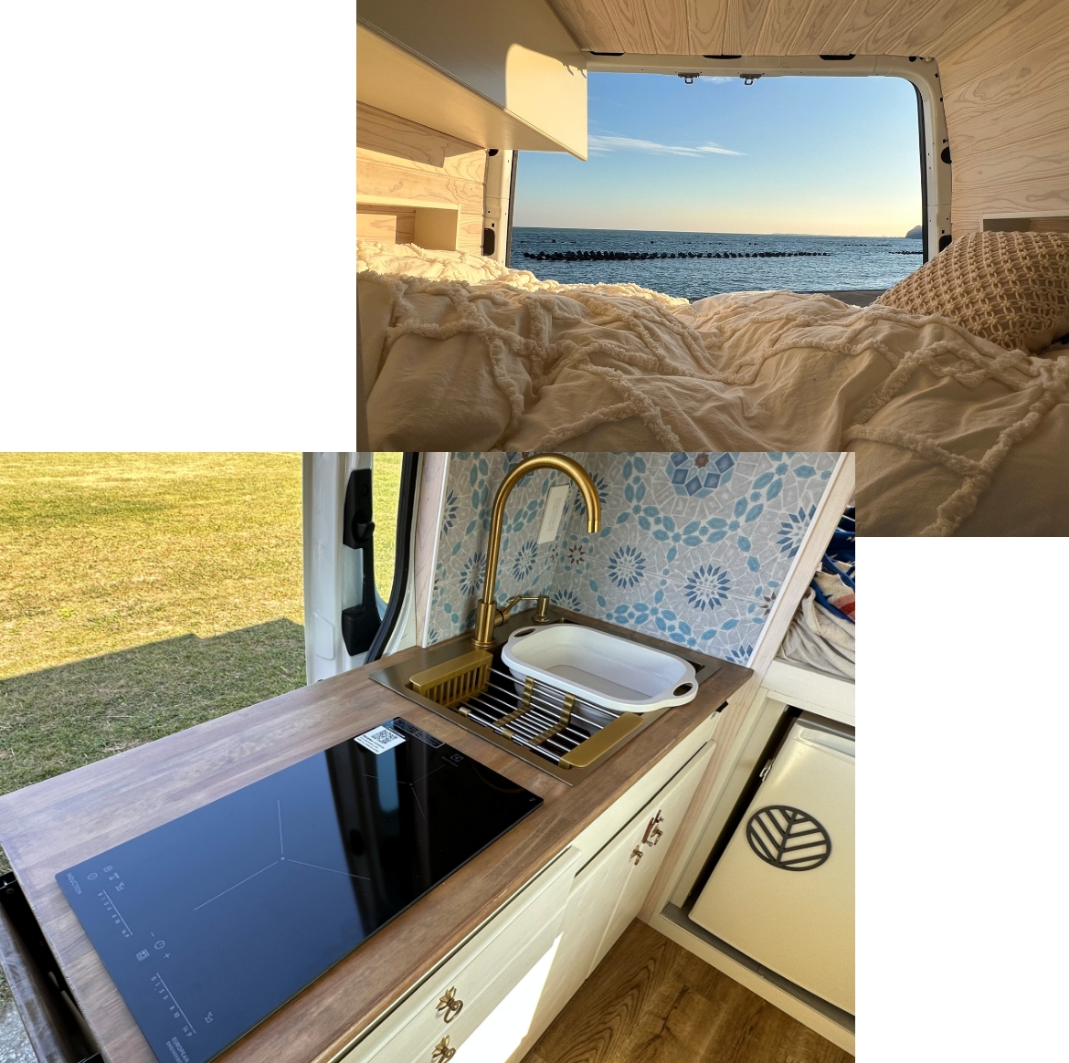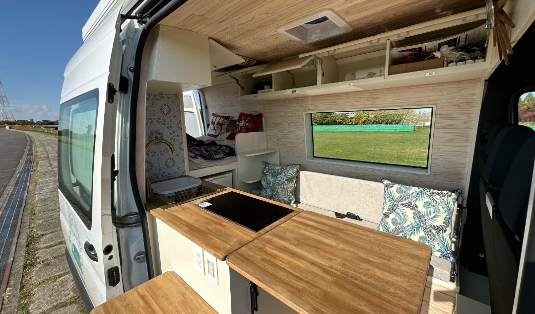 2コンロに充実の広さのシンク、車内とは思えないキッチンスペースを完備しています。お好みの食材を持ち込んで、すぐに調理が可能です。