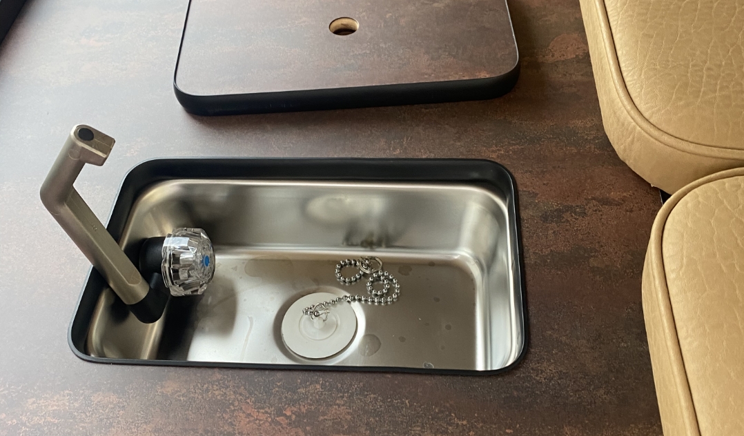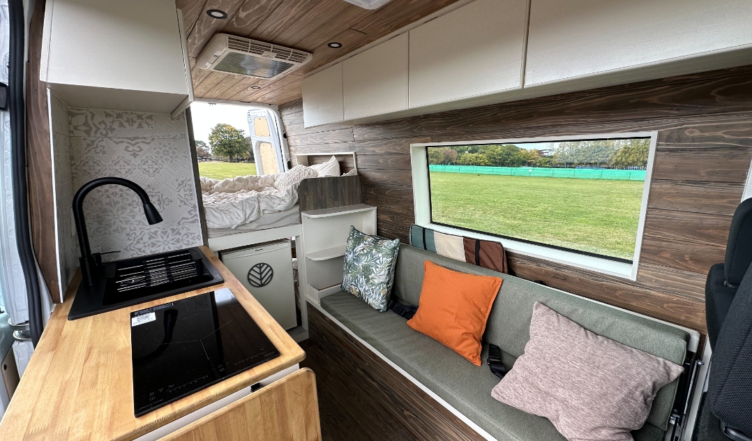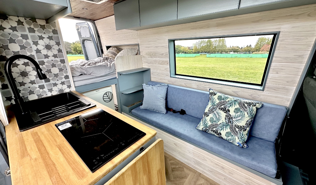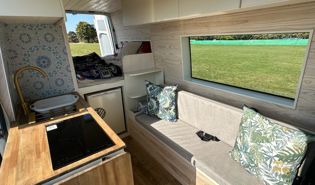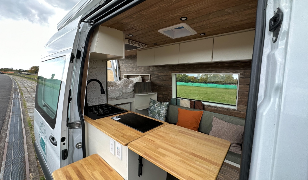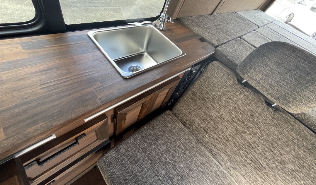 2コンロに充実の広さのシンク、車内とは思えないキッチンスペースを完備しています。お好みの食材を持ち込んで、すぐに調理が可能です。